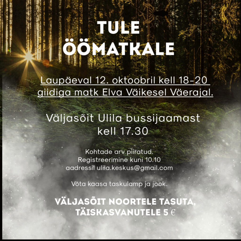 Öömatk Väikesel Väerajal Elvas. Matk toimub 12. oktoobril algusega kell 18. Võta kaasa taskulamp ja jook.Matka giidiks on Anni Käärst.Pildid.