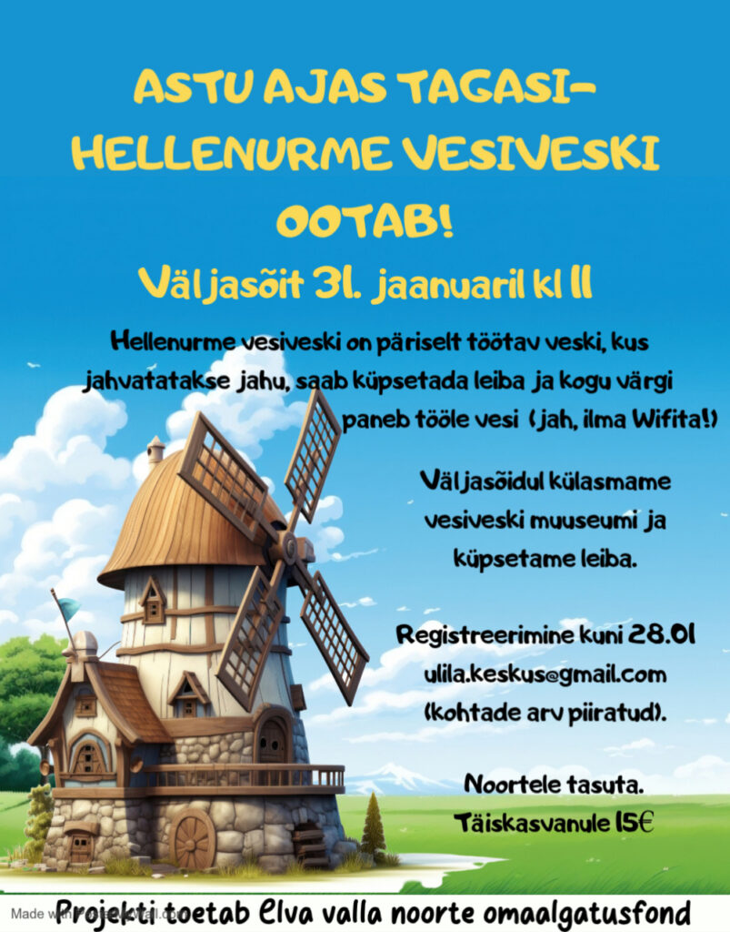 Väljasõit Hellenurme vesiveskisse toimub 31.01 kl 11 Ulilast (Puhjast 10.45 Puhja kooli peatusest).
